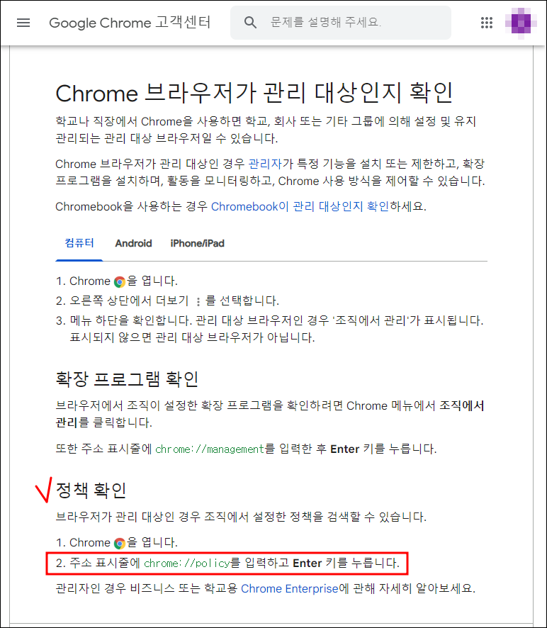 ▼ 조직에서 설정한 정책을 검색하기 위해 chrome://policy를 입력하여 들어갔습니다.