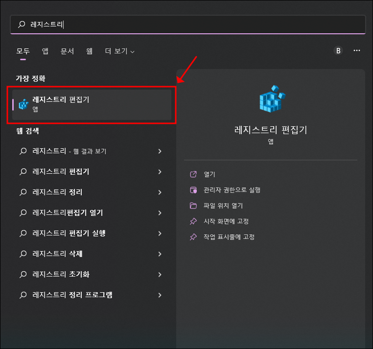 ▼ 윈도 검색창에 '레지스트리'를 입력하여 [레지스트리 편집기]를 실행해주세요.
