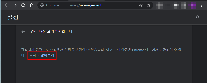 ▼ 크롬 브라우저에서 설정에 들어가다가 눈에 띈 '조직에서 관리' 문구입니다.
