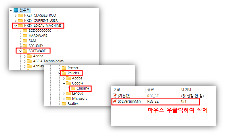 ▼ [HKEY_LOCAL_MACHINE] - [SOFRWARE] - [Policies] - [Google] - [Chrome] 경로로 들어가시고,