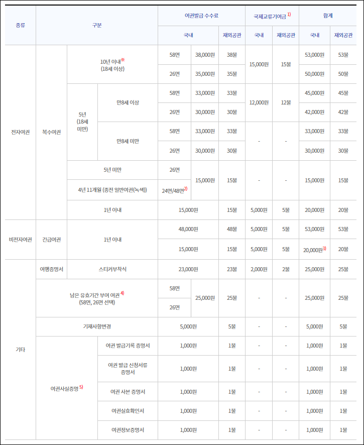 여권 발급 수수료는 아래 사진을 참고하시기 바랍니다.