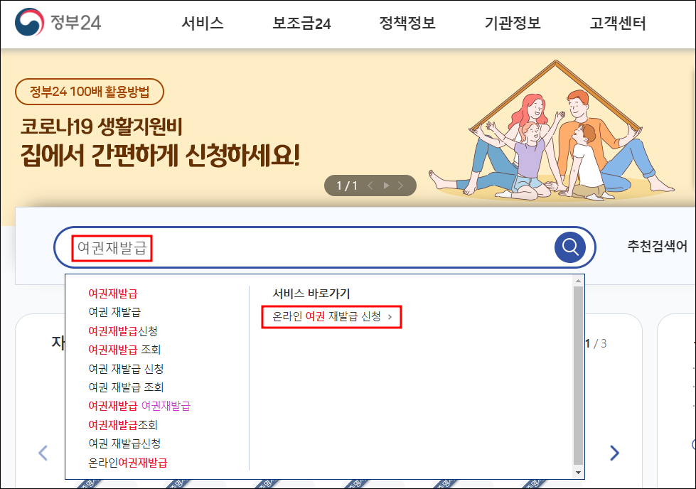 홈페이지에서 아래와 같이 검색창에 [여권재발급]을 검색 한 뒤