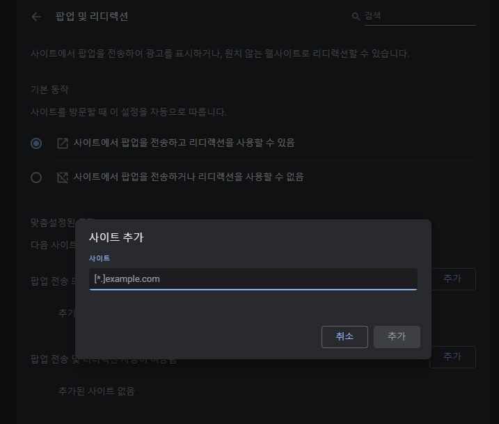 팝업을 원하는 사이트를 등록해주는 방법을 선택할 수도 있습니다.