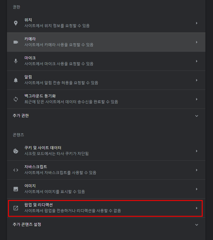 제일 아래 [팝업 및 리디렉션]을 선택하여 들어가 주세요.