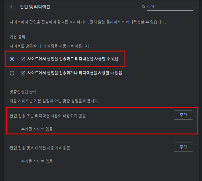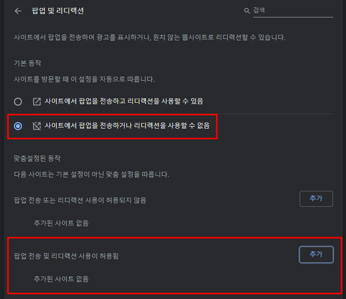 저는 기본설정으로 팝업을 허용하지 않고, 팝업을 원하는 사이트만 등록해주는 것으로 설정했습니다.